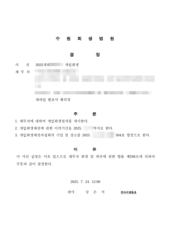 이에 따라, 신청인의 급여의 압류를 중지시키기 위해 신속하게 중지명령신청을 함과 동시에 회생 사건의 변제금을 인가결정 이후 1개월부터 납입 할 수 있도록 변제계획안 수정신청을 하였습니다.