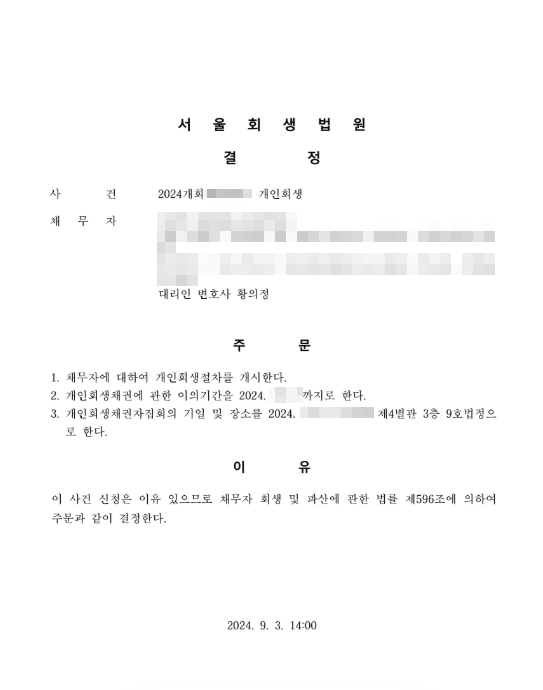 “ 신청인께서 절차 진행에 대해 많이 어려워하시고 큰 부담을 가지고 계셨기 때문에, 보정권고를 최소화하여 빠른 개시결정을 받는 것을 최우선 목표로 하였습니다. 저희 담당직원이 적극적으로 미비한 부분을 보완하면서 신속하게 대응하였고, 추가 지연 없이 빠르게 개시결정을 받을 수 있었습니다. 케이제이와 함께 하시면, 누구라도 큰 어려움없이 성공적으로 진행하실 수 있습니다. ”