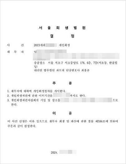 #도박 코인투자 실패로 인한 채무 - 원금 65% 탕감 본문 사례 개요 탕감률 55% 서울회생법원 총 채무액 3,013만원 월 변제금 25만원 변제 기간 24개월 결정문 신청인 소개 나이 30대 성별 남성 직업 유튜브편집자 사업경영의 악화와 주식 및 코인투자의 실패로 총 채무액이 1억원을 초과하게 되었고, 사업은 폐업하고 이후 지인을 통하여 프리랜서(유튜브 편집)로 일을 시작하여 개인회생 신청을 하게 되었습니다. 진행 과정 2024.08.12 신청서 제출 최종 결과 탕감률 55% 총 채무액 3,013만원 중, 1,657만원 탕감 담당 변호사 담당 변호사 전기범 대표변호사 “ 승소했어요 ” 목록으로